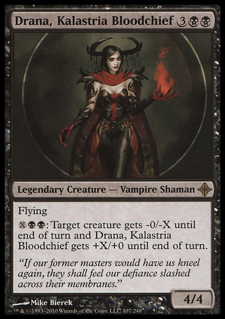 | Oracle Text | Flying {{x}}{{b}}{{b}}: Target creature gets -0/-X until end of turn and Drana, Kalastria Bloodchief gets +X/+0 until end of turn. | ||
