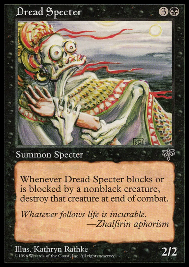 | Oracle Text | Whenever Dread Specter blocks or becomes blocked by a nonblack creature, destroy that creature at end of combat. | ||