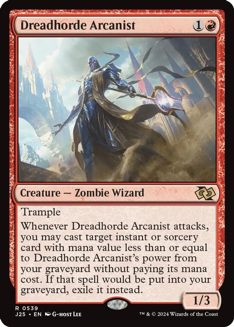 whenever dreadhorde arcanist attacks, you may cast target instant or sorcery card with mana value less than or equal to dreadhorde arcanist's power from your graveyard without paying its mana cost. if that spell would be put into your graveyard, exile it instead. | ||