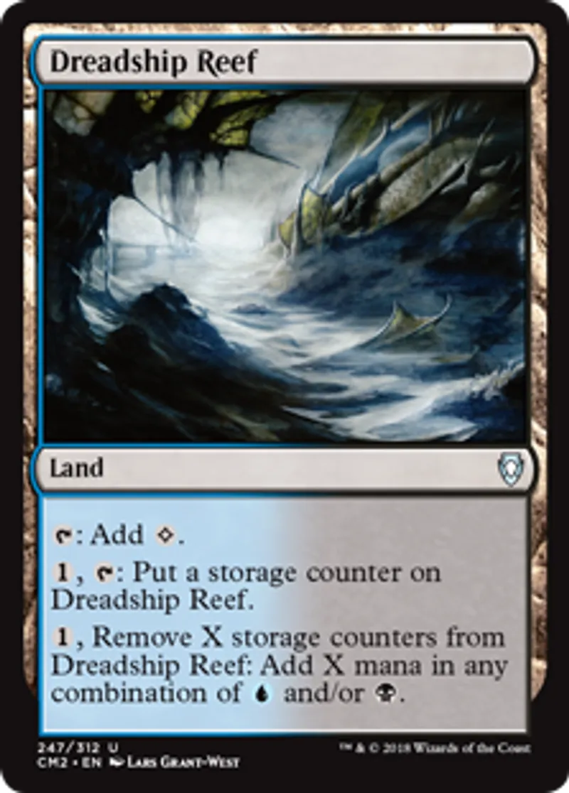 | Oracle Text | {{t}}: Add {{Colorless}}. {{1}}, {{t}}: Put a storage counter on Dreadship Reef. {{1}}, Remove X storage counters from Dreadship Reef: Add X mana in any combination of {{u}} and/or {{b}}. | ||