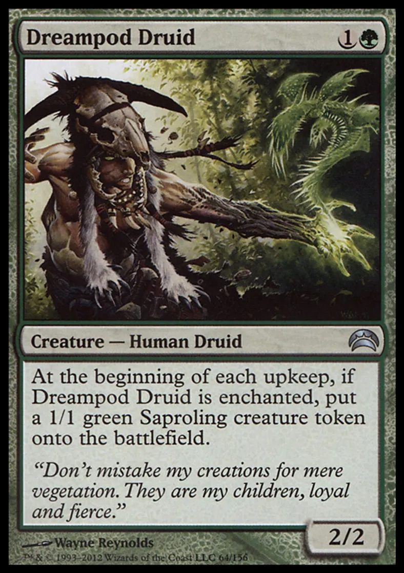 | Oracle Text | At the beginning of each upkeep, if Dreampod Druid is enchanted, put a 1/1 green Saproling creature token onto the battlefield. | ||