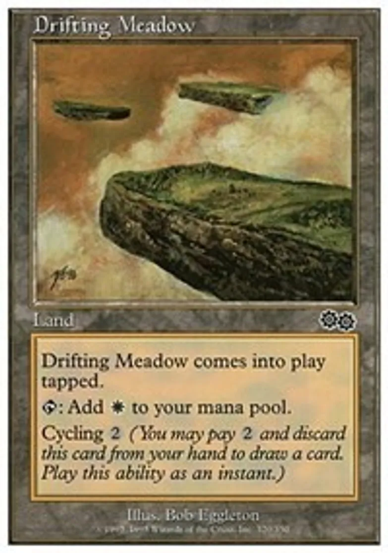 | Oracle Text | Drifting Meadow comes into play tapped. {{t}}: Add {{w}} to your mana pool. Cycling {{2}} (You may pay {{2}} and discard this card from your hand to draw a card. Play this ability as an instant.) | ||