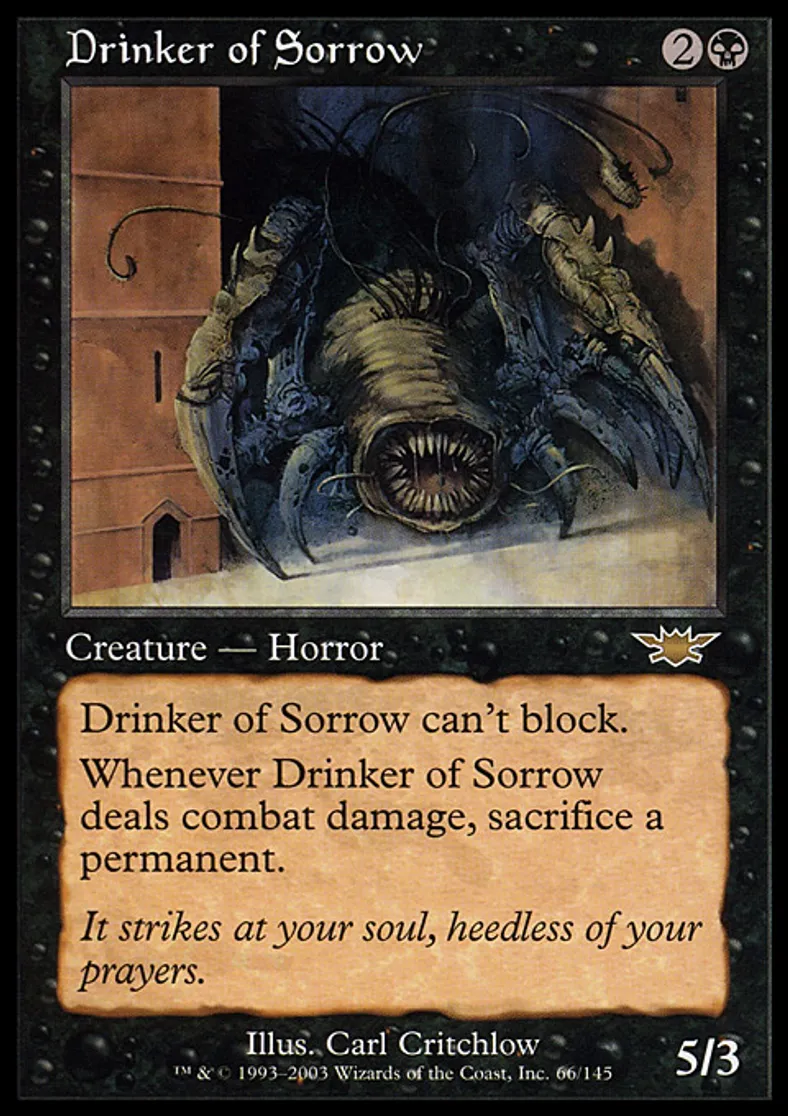 | Oracle Text | Drinker of Sorrow can't block. Whenever Drinker of Sorrow deals combat damage, sacrifice a permanent. | ||
