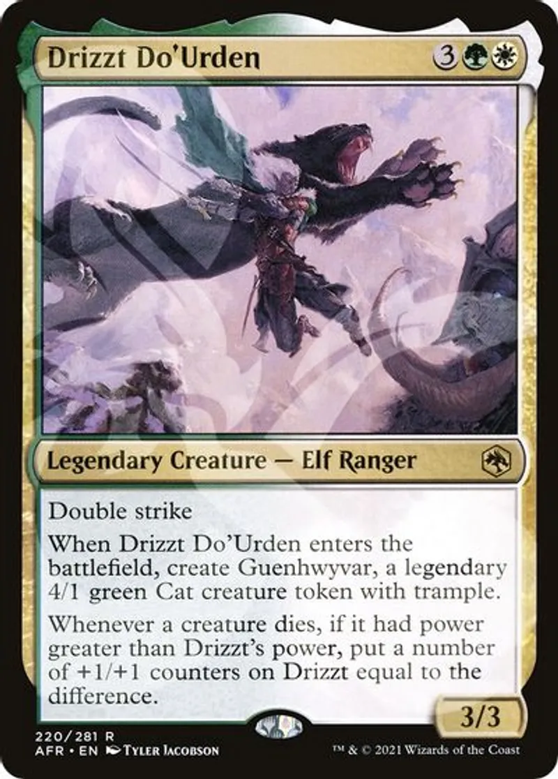 Whenever a creature dies, if it had power greater than Drizzt’s power, put a number of +1/+1 counters on Drizzt equal to the difference. | ||