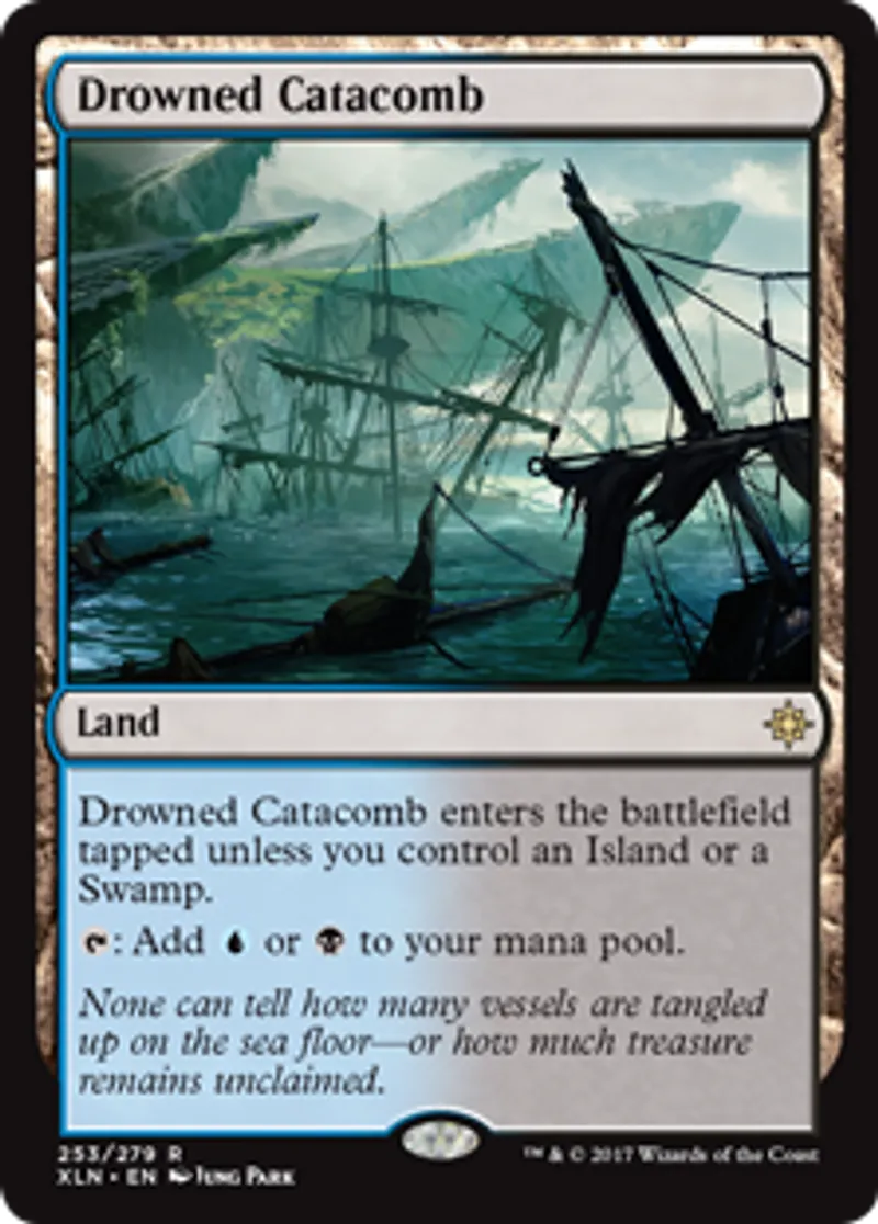| Oracle Text | Drowned Catacomb enters the battlefield tapped unless you control an Island or a Swamp. {{t}}: Add {{u}} or {{b}} to your mana pool. | ||