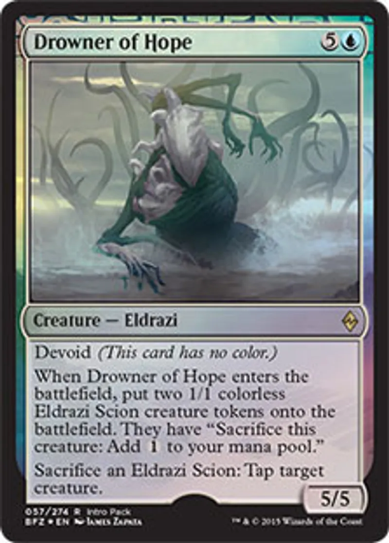 | Oracle Text | Devoid (This card has no color.)\r\n\r\nWhen Drowner of Hope enters the battlefield, put two 1/1 colorless Eldrazi Scion creature tokens onto the battlefield. They have \"Sacrifice this creature: add {{1}} to your mana pool.\"\r\n\r\nSacrifice an Eldrazi Sction: Tap target creature. | ||