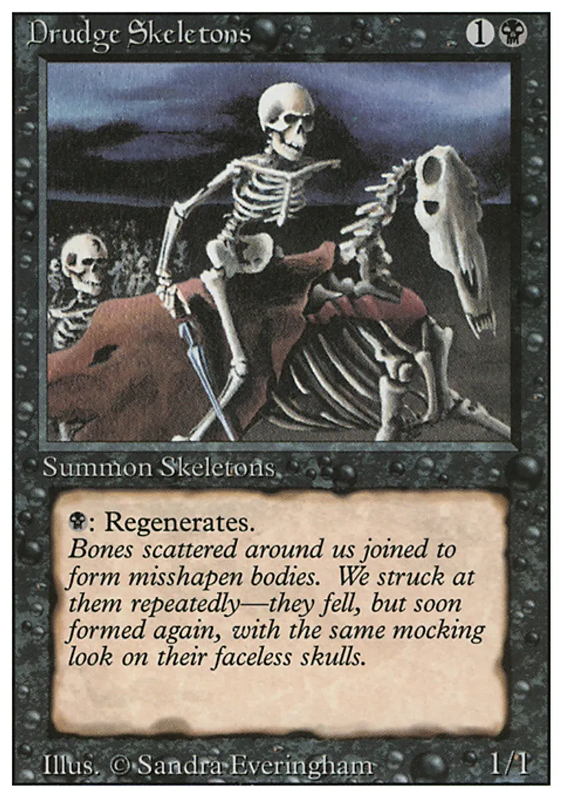 | Oracle Text | {{b}}: Regenerate Drudge Skeletons. (The next time this creature would be destroyed this turn, it isn't. Instead tap it, remove all damage from it, and remove it from combat.) | ||