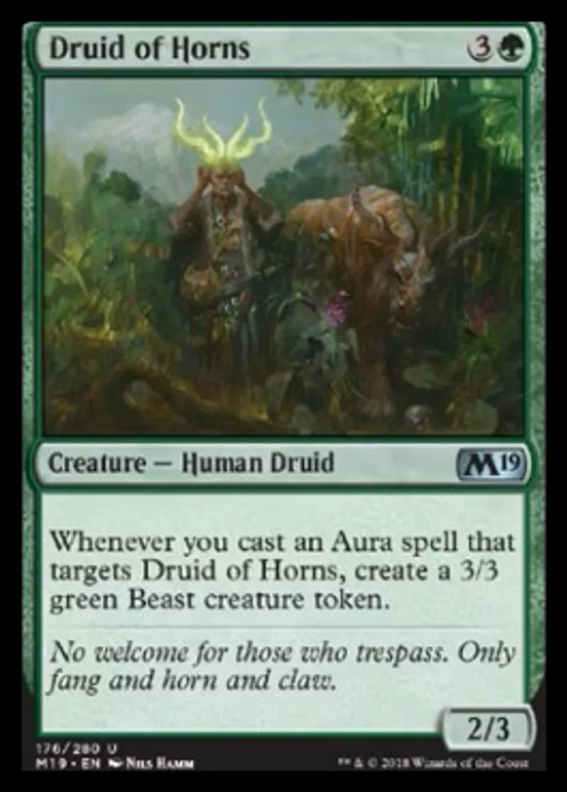 | Oracle Text | Whenever you cast an Aura spell that targets Druid of Horns, create a 3/3 green Beast creature token. | ||