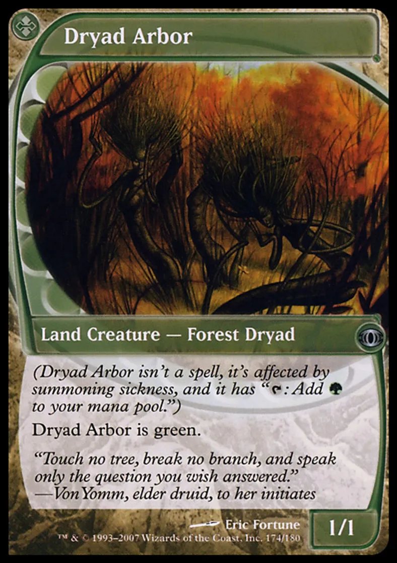| Oracle Text | (Dryad Arbor isn't a spell, it's affected by summoning sickness, and it has "{{t}}: Add {{g}} to your mana pool.") | ||