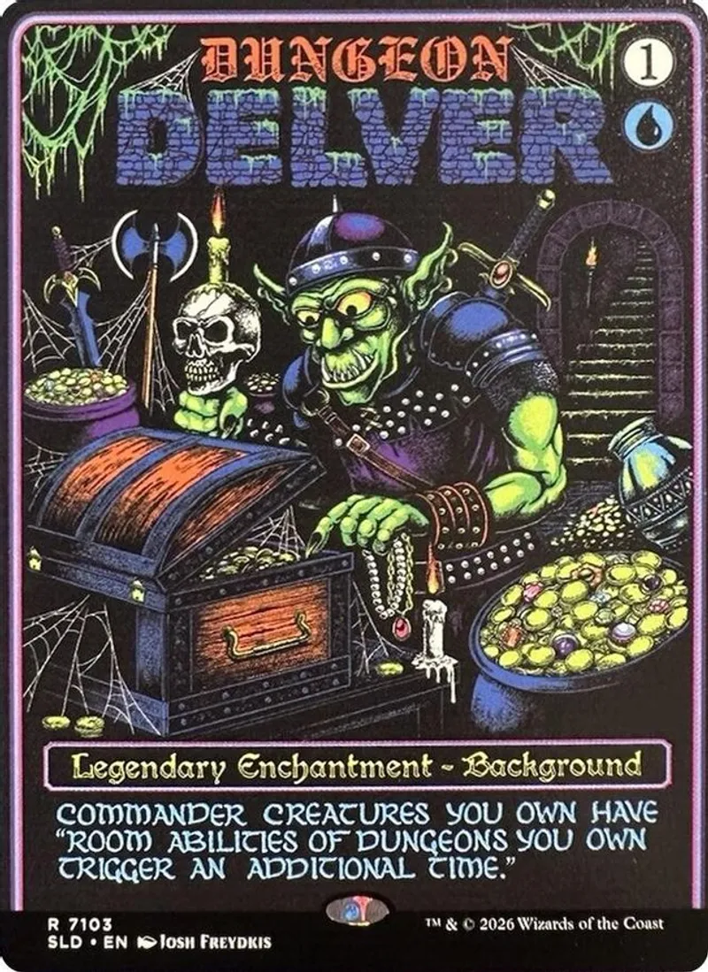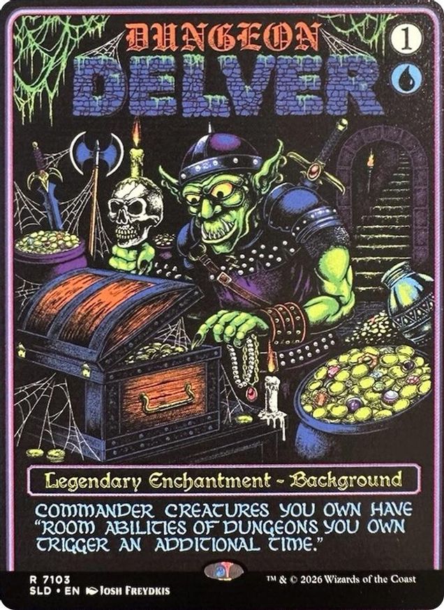 Magic: the Gathering (mtg) Rare legendary enchantment — background Dungeon Delver from Secret Lair Drop Series (SLD) last updated 2026-03-26 01:39:03