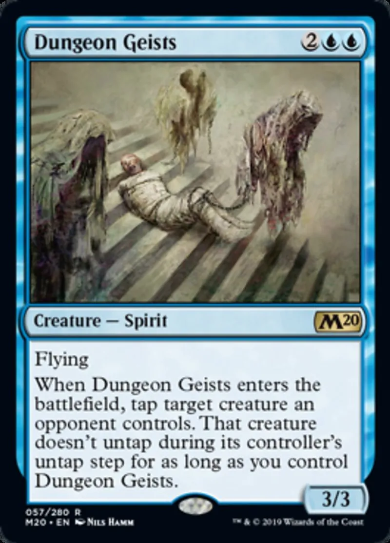 When Dungeon Geists enters the battlefield, tap target creature an opponent controls. That creature doesn't untap during its controller's untap step for as long as you control Dungeon Geists. | ||