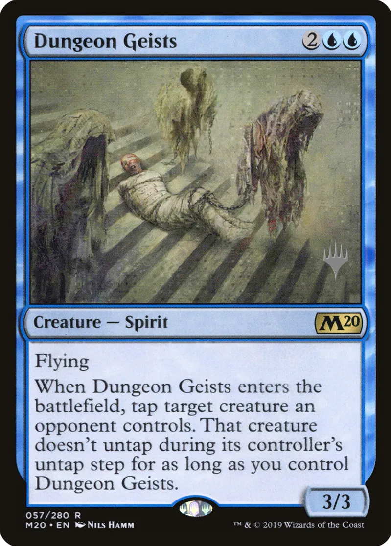 | Oracle Text | Flying\r\nWhen Dungeon Geists enters the battlefield, tap target creature an opponent controls. That creature doesn\'t untap during its controller\'s untap step for as long as you control Dungeon Geists. | ||