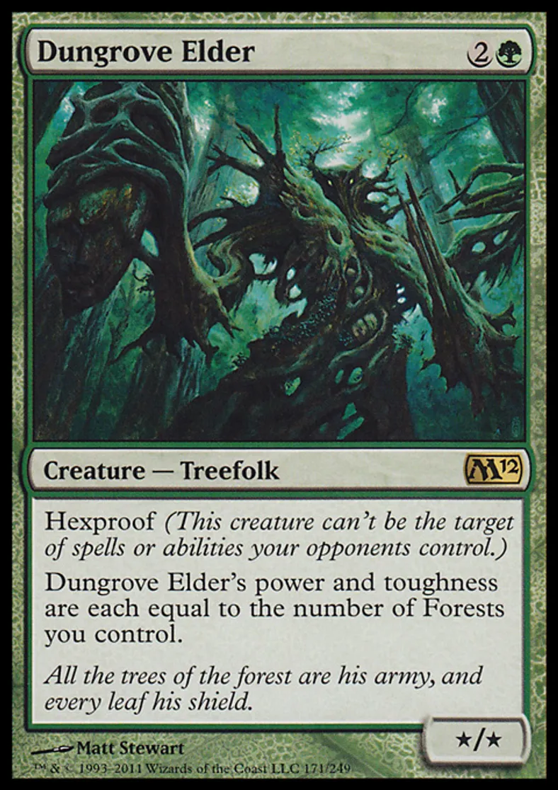 | Oracle Text | Hexproof (This creature can't be the target of spells or abilities your opponents control.) Dungrove Elder's power and toughness are each equal to the number of Forests you control. | ||