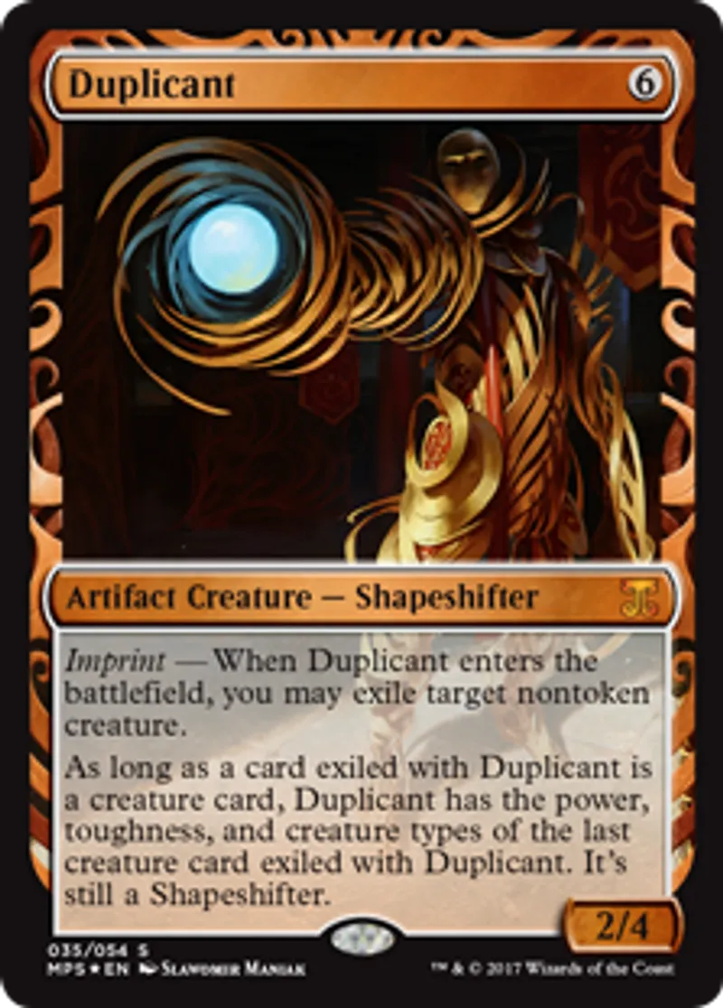 | Oracle Text | Imprint — When Duplicant enters the battlefield, you may exile target nontoken creature. As long as a card exiled with Duplicant is a creature card, Duplicant has the power, toughness, and creature types of the last creature card exiled with Duplicant. It's still a Shapeshifter. | ||