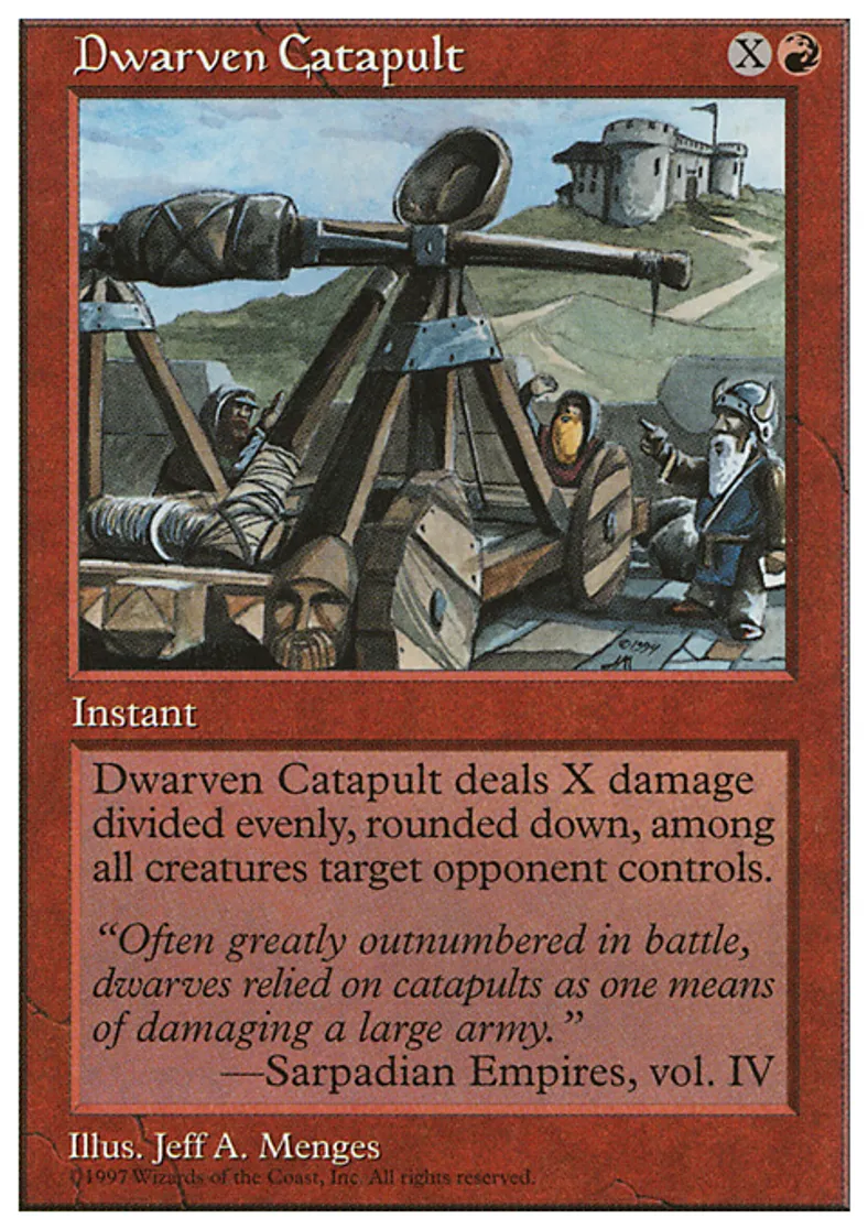 | Oracle Text | Dwarven Catapult deals X damage divided evenly, rounded down, among all creatures target opponent controls. | ||