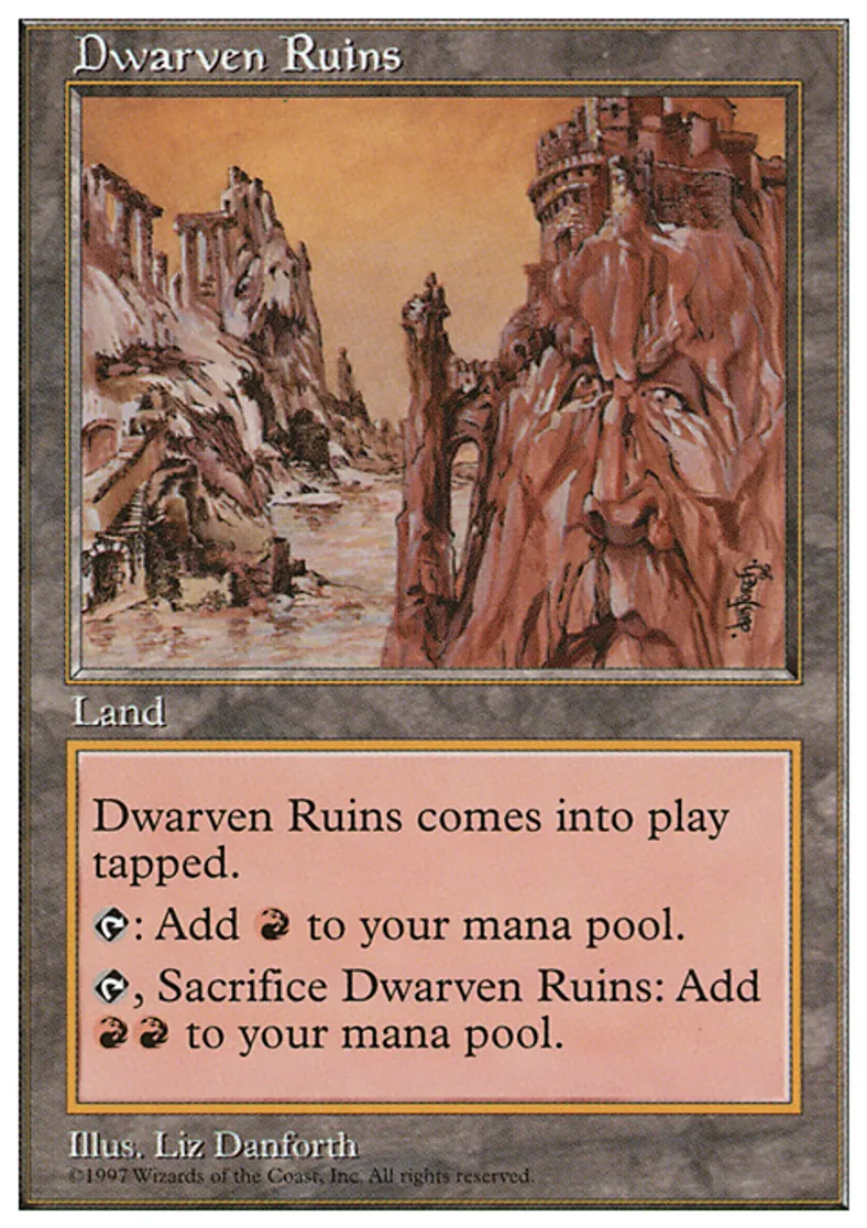 | Oracle Text | Dwarven Ruins enters the battlefield tapped. {{t}}: Add {{r}} to your mana pool. {{t}}, Sacrifice Dwarven Ruins: Add {{r}}{{r}} to your mana pool. | ||