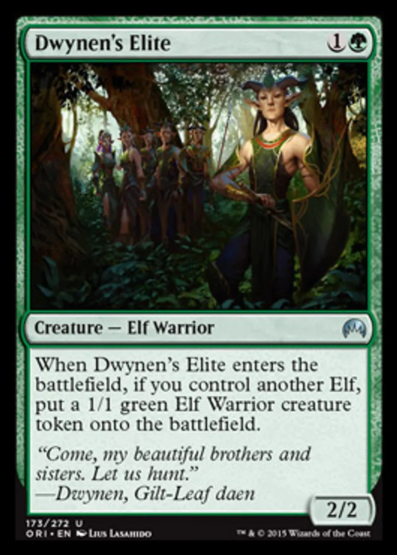 | Oracle Text | When Dwynen's Elite enters the battlefield, if you control another Elf, put a 1/1 green Elf Warrior creature token onto the battlefield. | ||