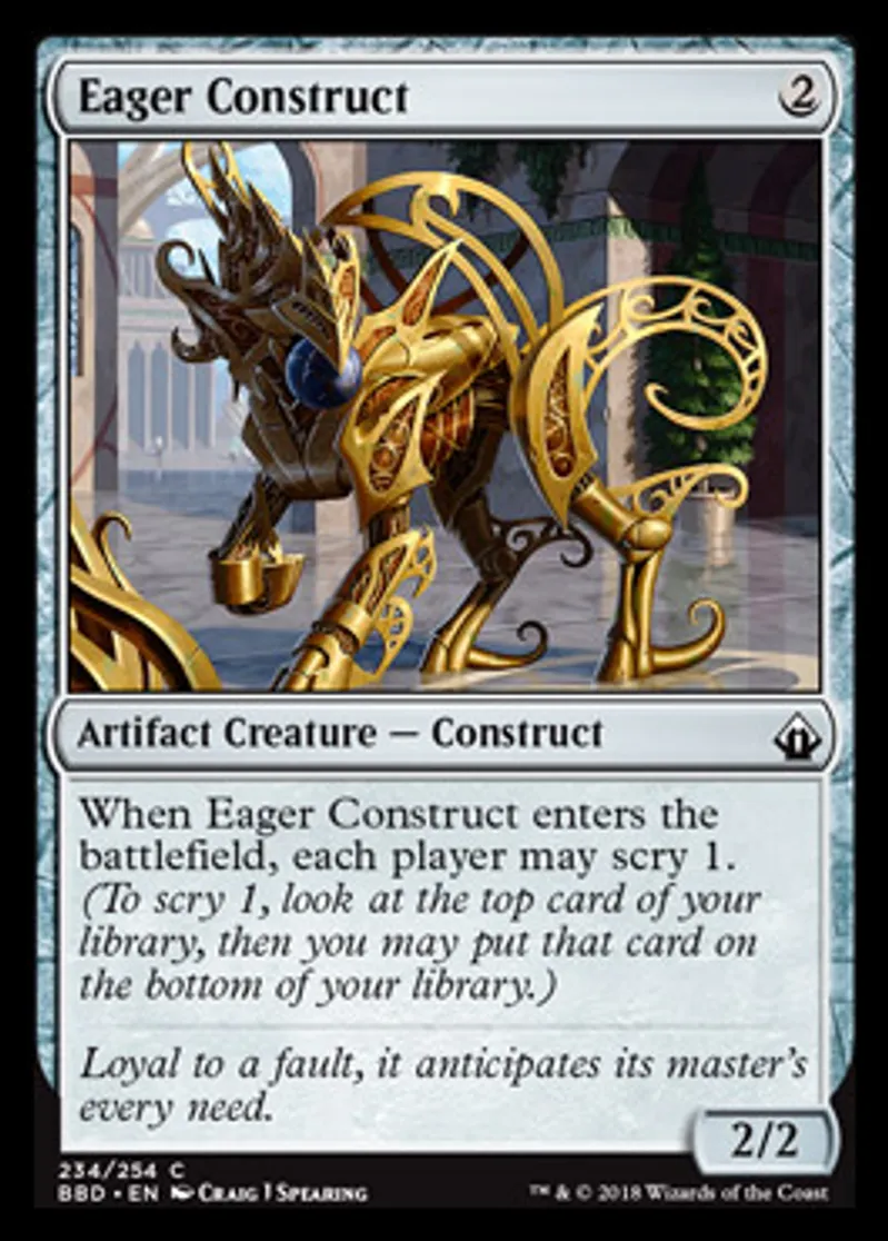 | Oracle Text | When Eager Construct enters the battlefield, each player may scry 1. (To scry 1, look at the top card of your library, then you may put that card on the bottom of your library.) | ||