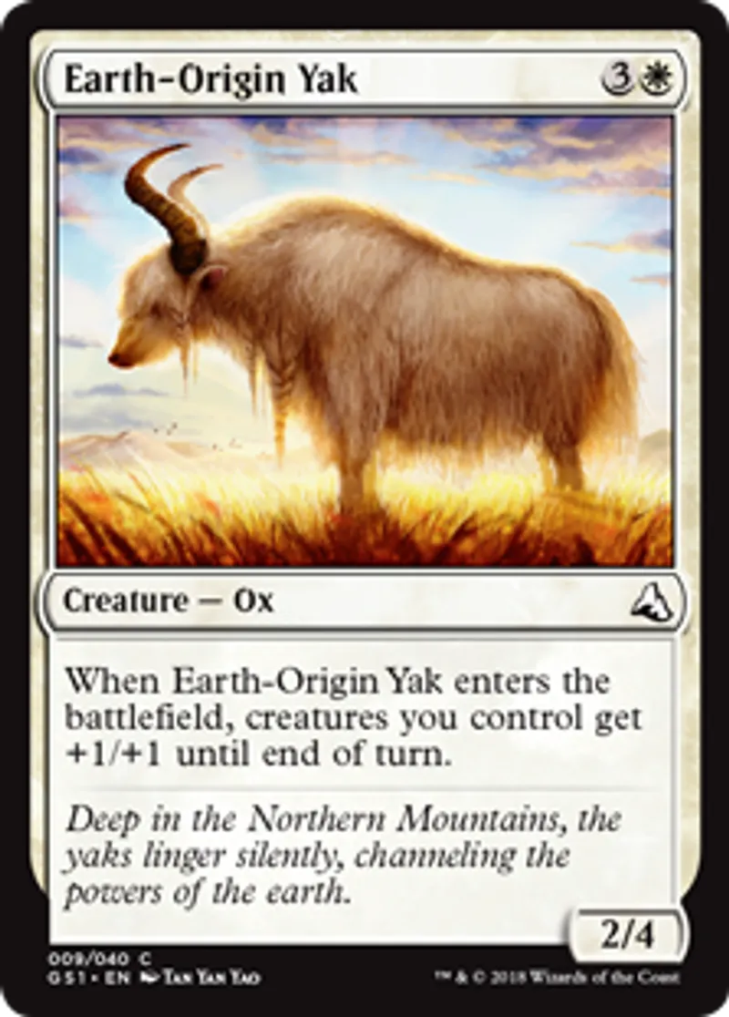 | Oracle Text | When Earth-Origin Yak enters the battlefield, creatures you control get +1/+1 until end of turn. | ||