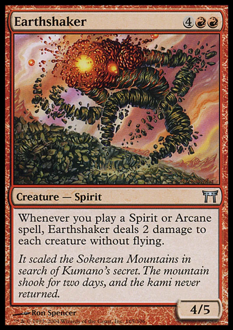 | Oracle Text | Whenever you cast a Spirit or Arcane spell, Earthshaker deals 2 damage to each creature without flying. | ||