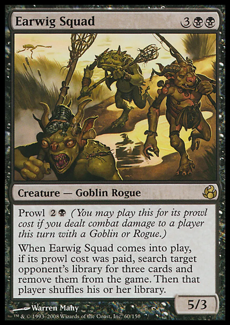 | Oracle Text | Prowl {{2}}{{b}} (You may cast this for its prowl cost if you dealt combat damage to a player this turn with a Goblin or Rogue.) When Earwig Squad enters the battlefield, if its prowl cost was paid, search target opponent's library for three cards and exile them. Then that player shuffles his or her library. | ||