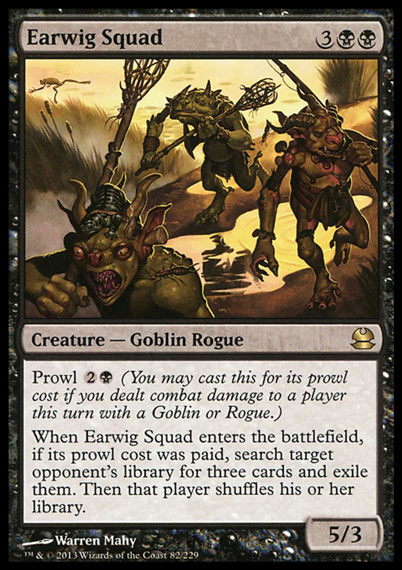 | Oracle Text | Prowl {{2}}{{b}} (You may cast this for its prowl cost if you dealt combat damage to a player this turn with a Goblin or Rogue.) When Earwig Squad enters the battlefield, if its prowl cost was paid, search target opponent's library for three cards and exile them. Then that player shuffles his or her library. | ||
