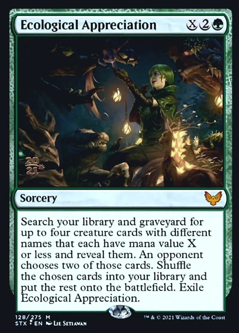 | Oracle Text | Search your library and graveyard for up to four creature cards with different names that each have mana value X or less and reveal them. An opponent chooses two of those cards. Shuffle the chosen cards into your library and put the rest onto the battlefield. Exile Ecological Appreciation. | ||