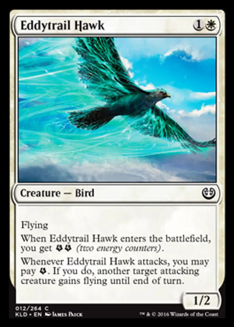 | Oracle Text | Flying When Eddytrail Hawk enters the battlefield, you get {{Energy}}{{Energy}} (two energy counters). Whenever Eddytrail Hawk attacks, you may pay {{Energy}}. If you do, another target attacking creature gains flying until end of turn. | ||