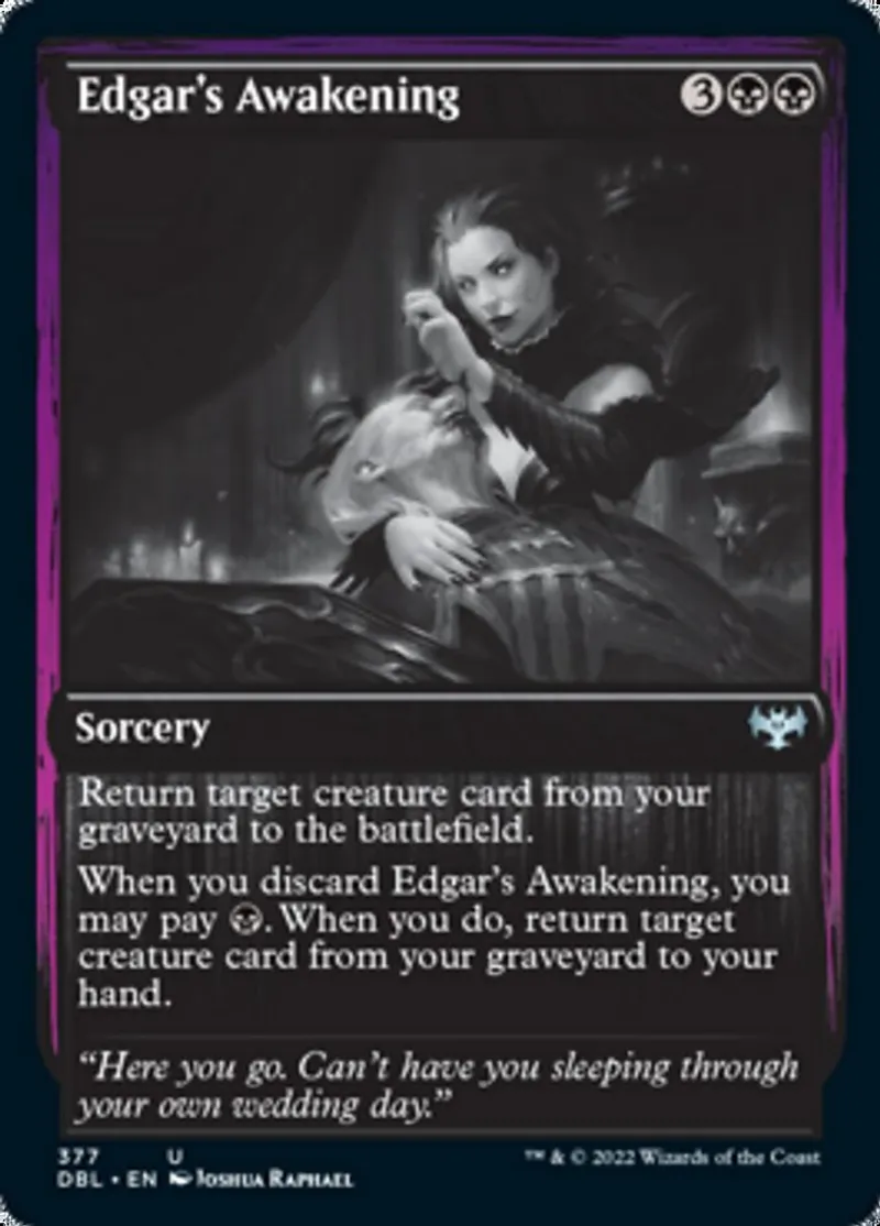 When you discard Edgar's Awakening, you may pay {B}. When you do, return target creature card from your graveyard to your hand. | ||
