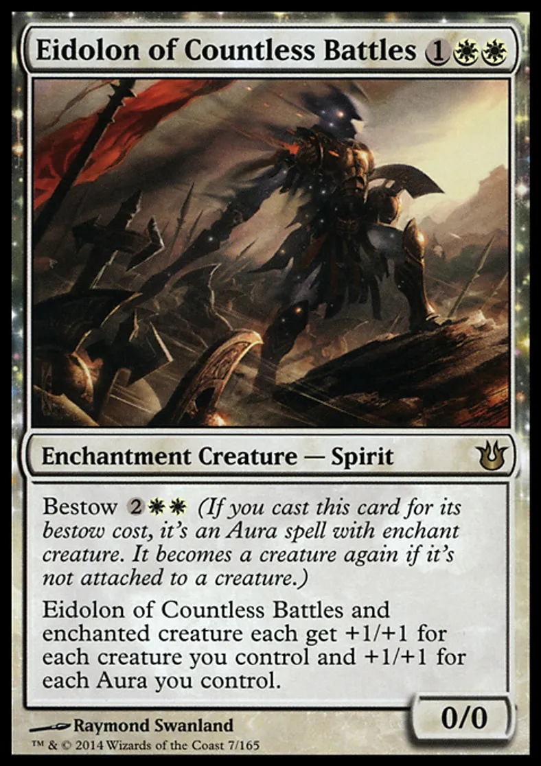 | Oracle Text | Bestow {{2}}{{w}}{{w}} (If you cast this card for its bestow cost, it's an Aura spell with enchant creature. It becomes a creature again if it's not attached to a creature.) Eidolon of Countless Battles and enchanted creature each get +1/+1 for each creature you control and +1/+1 for each Aura you control. | ||