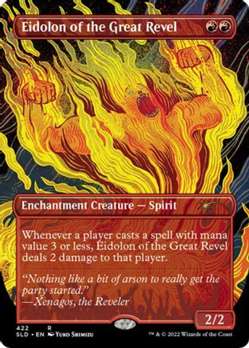 | Oracle Text | Whenever a player casts a spell with mana value 3 or less, Eidolon of the Great Revel deals 2 damage to that player. | ||