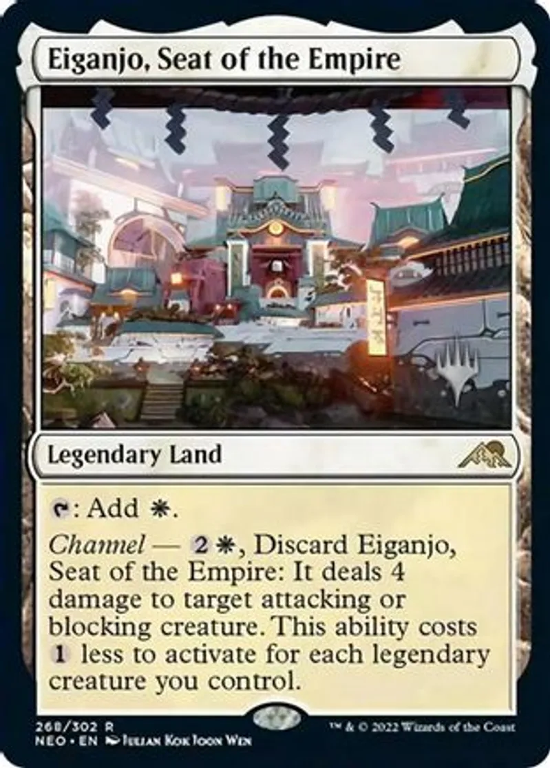 Channel — {{2}}{{w}}, Discard Eiganjo, Seat of the Empire: It deals 4 damage to target attacking or blocking creature. This ability costs {{1}} less to activate for each legendary creature you control. | ||