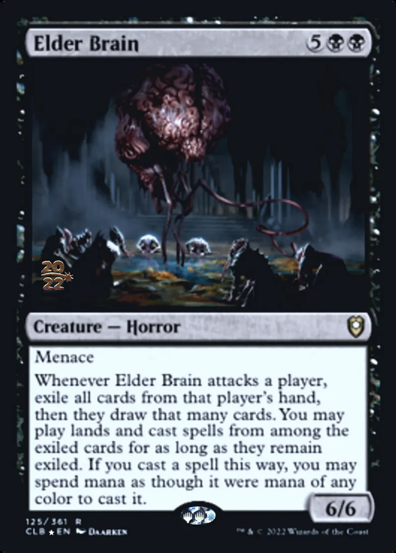 Whenever Elder Brain attacks a player, exile all cards from that player's hand, then they draw that many cards. You may play lands and cast spells from among the exiled cards for as long as they remain exiled. If you cast a spell this way, you may spend mana as though it were mana of any color to cast it. | ||
