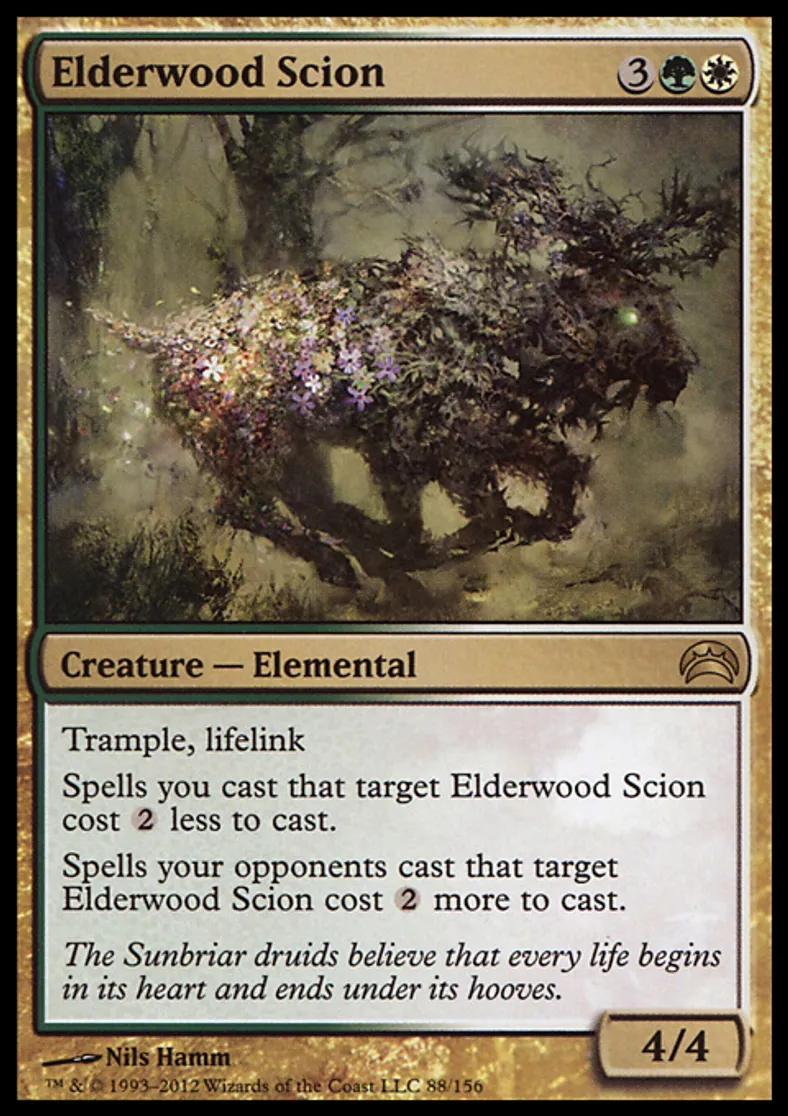 | Oracle Text | Trample, lifelink Spells you cast that target Elderwood Scion cost {{2}} less to cast. Spells your opponents cast that target Elderwood Scion cost {{2}} more to cast. | ||