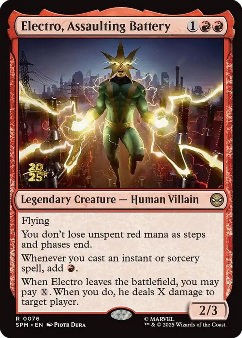 Magic: the Gathering (mtg) Rare legendary creature — human villain Electro, Assaulting Battery from Prerelease Cards (pPRE) last updated 2026-01-19 16:06:32