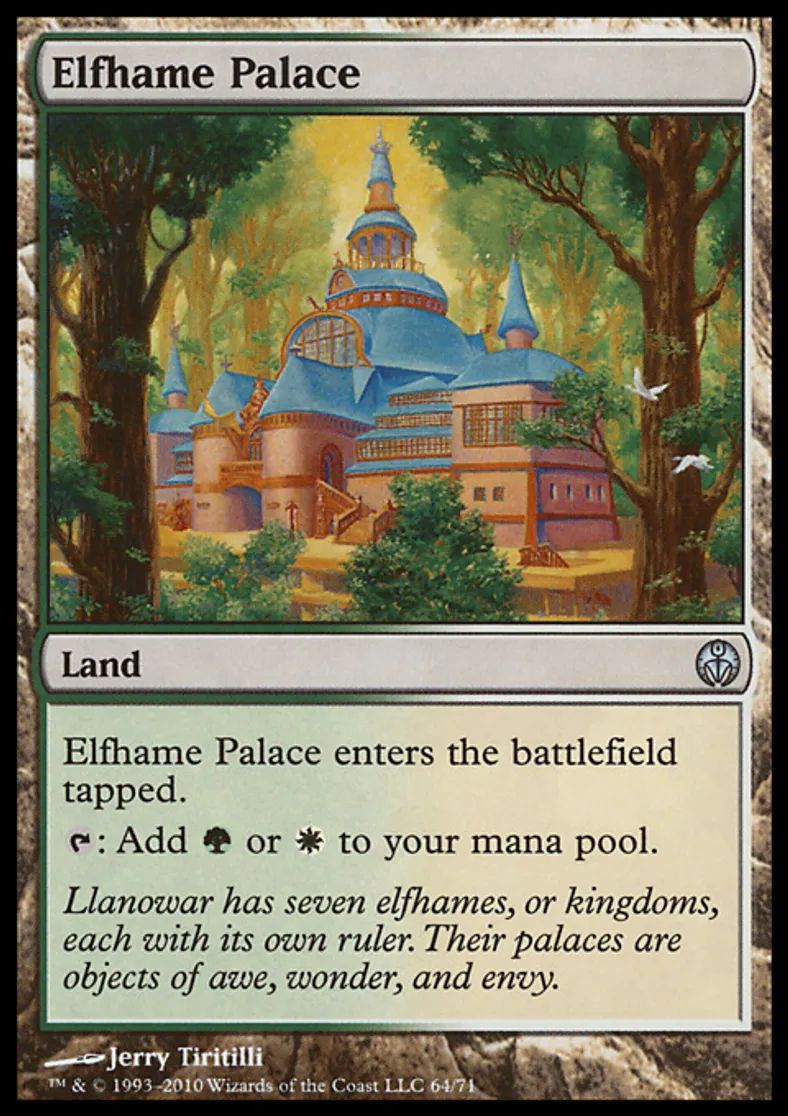 | Oracle Text | Elfhame Palace enters the battlefield tapped. {{t}}: Add {{g}} or {{w}} to your mana pool. | ||