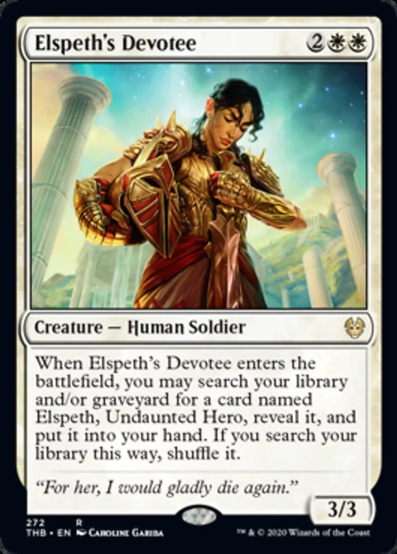| Oracle Text | When Elspeth's Devotee enters the battlefield, you may search your library and/or graveyard for a card named Elspeth, Undaunted Hero, reveal it, and put it into your hand. If you search your library this way, shuffle it. | ||