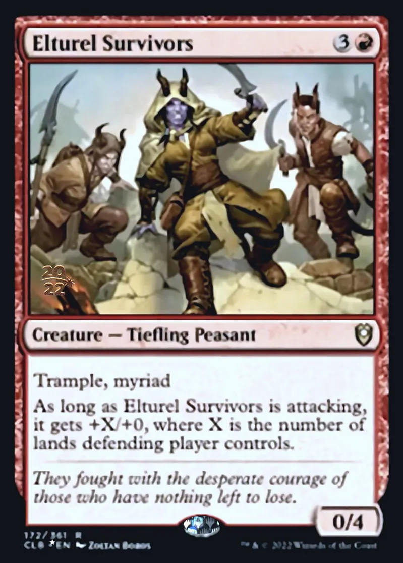 As long as Elturel Survivors is attacking, it gets +X/+0, where X is the number of lands defending player controls. | ||