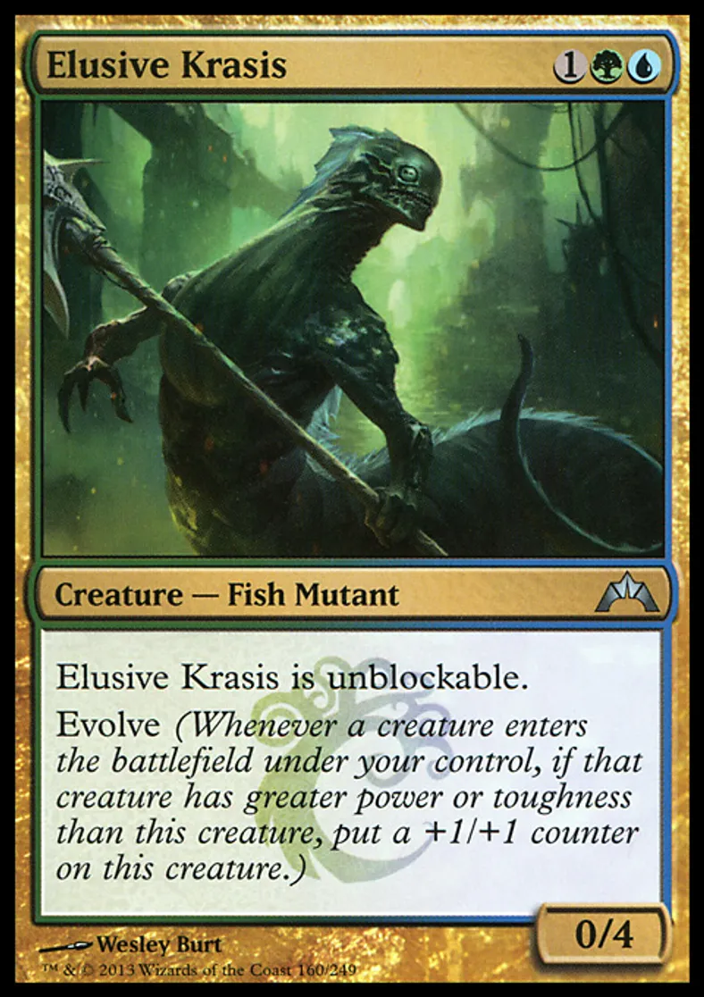 | Oracle Text | Elusive Krasis is unblockable. Evolve (Whenever a creature enters the battlefield under your control, if that creature has greater power or toughness than this creature, put a +1/+1 counter on this creature.) | ||