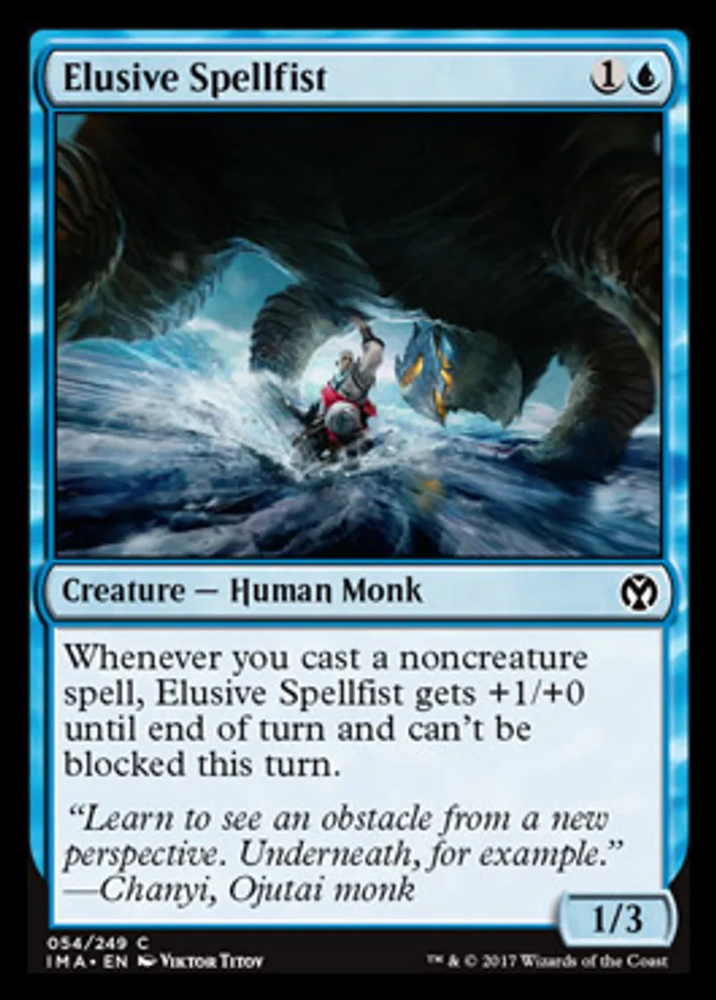 | Oracle Text | Whenever you cast a noncreature spell, Elusive Spellfist gets +1/+0 until end of turn and can't be blocked this turn. | ||