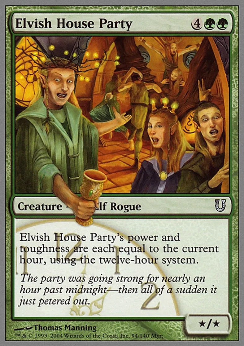 | Oracle Text | Elvish House Party's power and toughness are each equal to the current hour, using the twelve-hour system. | ||