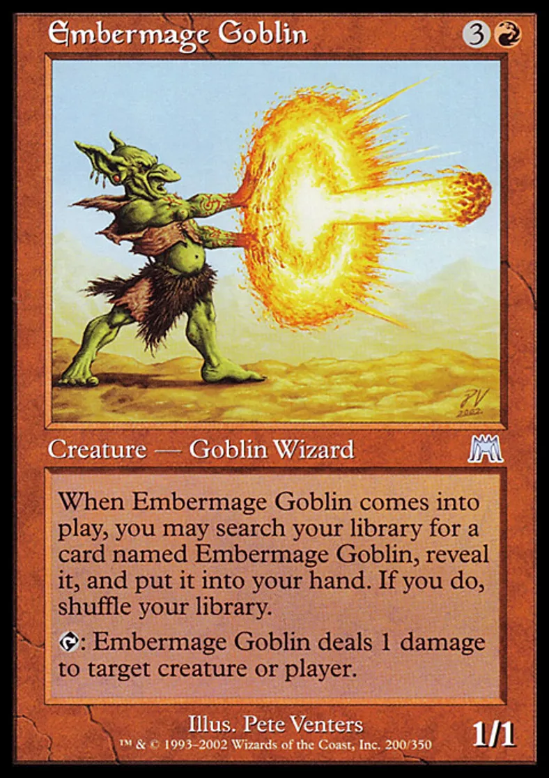| Oracle Text | When Embermage Goblin enters the battlefield, you may search your library for a card named Embermage Goblin, reveal it, and put it into your hand. If you do, shuffle your library. {{t}}: Embermage Goblin deals 1 damage to target creature or player. | ||