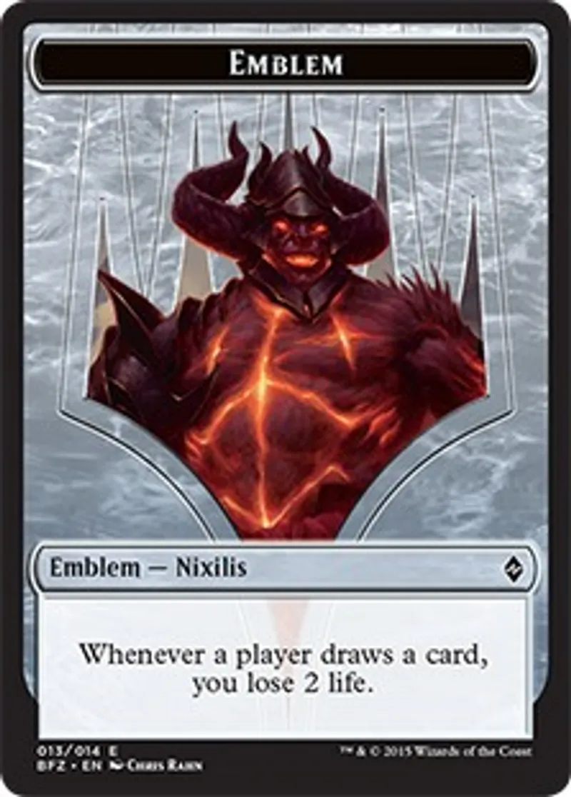Magic: the Gathering (mtg) Token Emblem - Nixilis Emblem - Ob Nixilis Reignited from Battle for Zendikar Tokens (TBFZ) last updated 2026-02-21 16:52:06