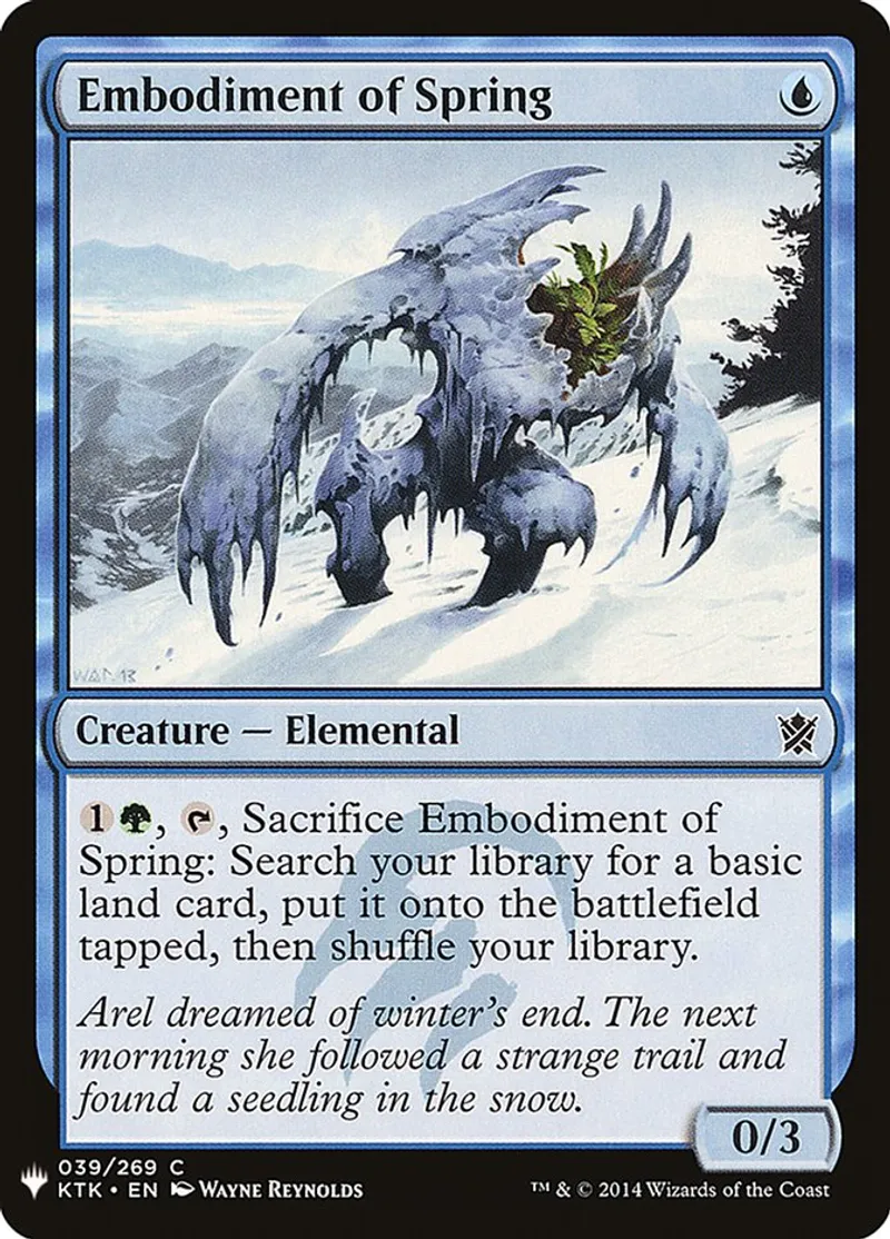| Oracle Text | {1}{G}, {T}, Sacrifice Embodiment of Spring: Search your library for a basic land card, put it onto the battlefield tapped, then shuffle your library. | ||