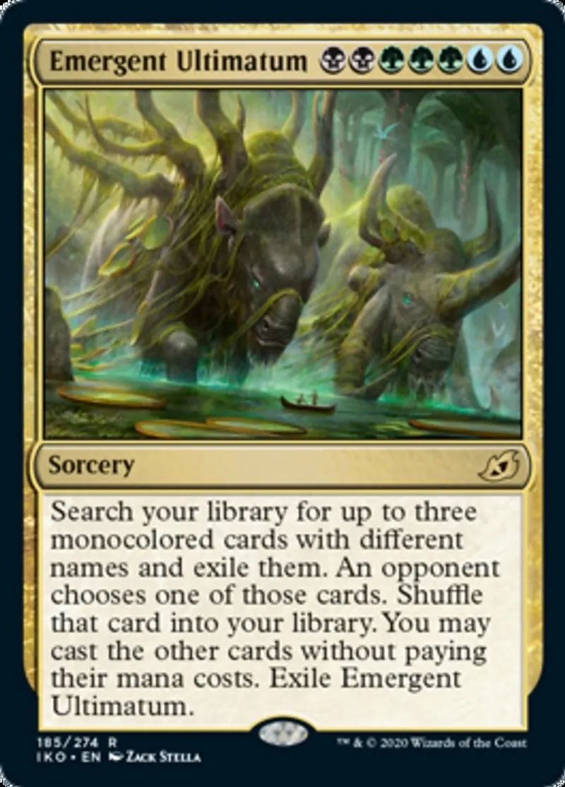 | Oracle Text | Search your library for up to three different monocolored cards with different names and exile them. An opponent chooses one of those cards. Shuffle that card into your library. You may cast the other cards without paying their mana costs. Exile Emergent Ultimatum. | ||