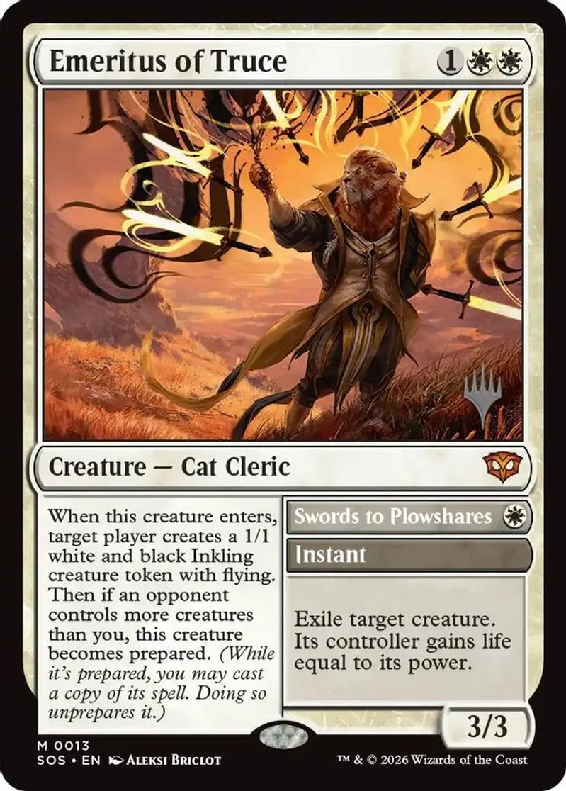 then if an opponent controls more creatures than you, this creature becomes prepared. (while it's prepared, you may cast a copy of its spell. doing so unprepares it.) swords to plowshares w instant exile target creature. its controller gains life equal to its power. | ||