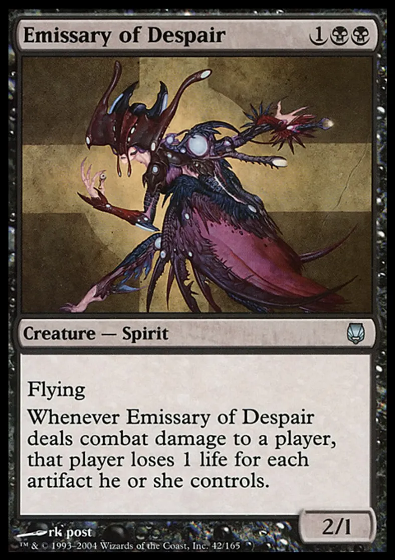| Oracle Text | Flying Whenever Emissary of Despair deals combat damage to a player, that player loses 1 life for each artifact he or she controls. | ||
