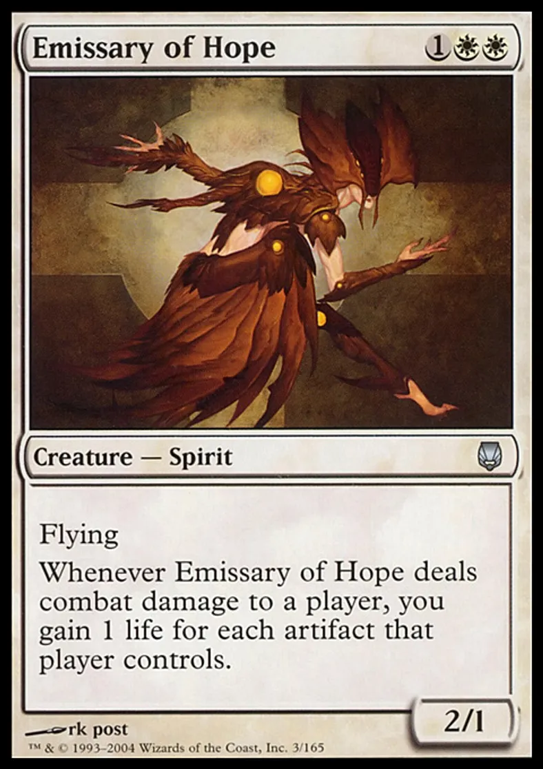 | Oracle Text | Flying Whenever Emissary of Hope deals combat damage to a player, you gain 1 life for each artifact that player controls. | ||