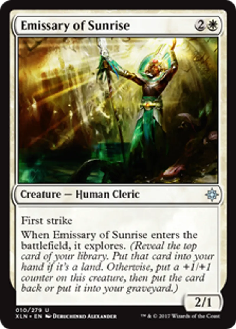 | Oracle Text | First strike When Emissary of Sunrise enters the battlefield, it explores. (Reveal the top card of your library. Put that card into your hand if it's a land. Otherwise, put a +1/+1 counter on this creature, then put the card back or put it into your graveyard.) | ||
