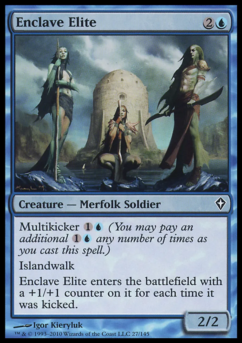 | Oracle Text | Multikicker {{1}}{{u}} (You may pay an additional {{1}}{{u}} any number of times as you cast this spell.) Islandwalk Enclave Elite enters the battlefield with a +1/+1 counter on it for each time it was kicked. | ||
